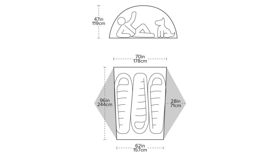 | Rain Fly Material | Silicone treated proprietary ultralight double rip-stop mixed denier nylon with 1200mm waterproof polyurethane coating. |